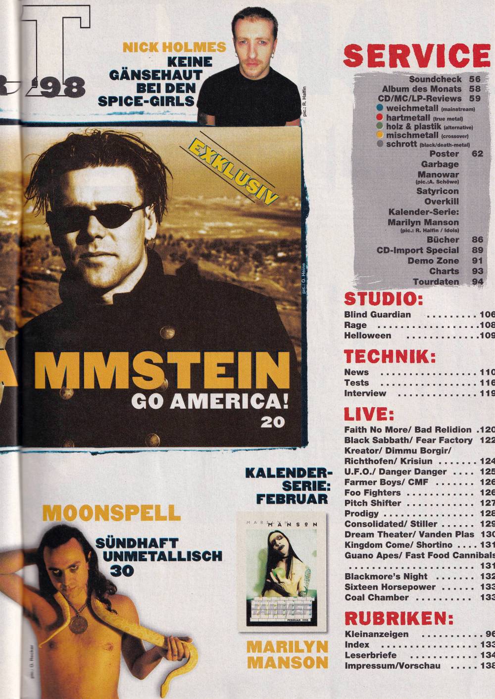 Rammstein, DAD, Ramones, Moonspell, Guano Apes, Prodigy, Deftones, Venom, Blind Guardian, Rage, 19 Seiten Plattenkritiken, Technikinfos, Live Reviews und vieles andere mehr