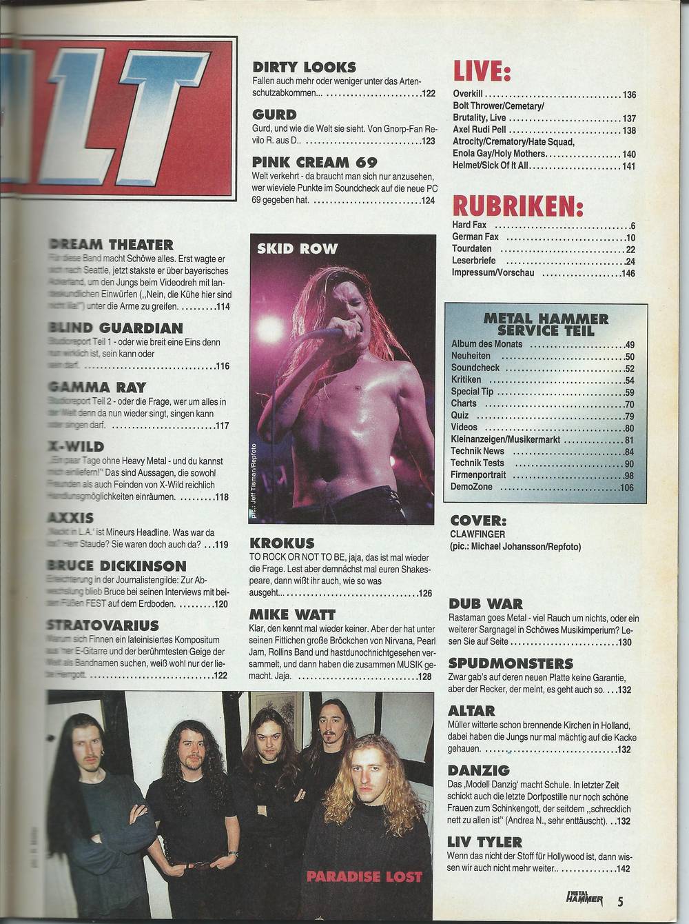 Clawfinger, Pink Cream 69, Blind Guardian, Skid Row, Motorhead, Death, Pretty Maids, Paradise Lost, Bates, Doro, Danzig, 18 Seiten Plattenkritiken, Technikinfos und vieles andere mehr