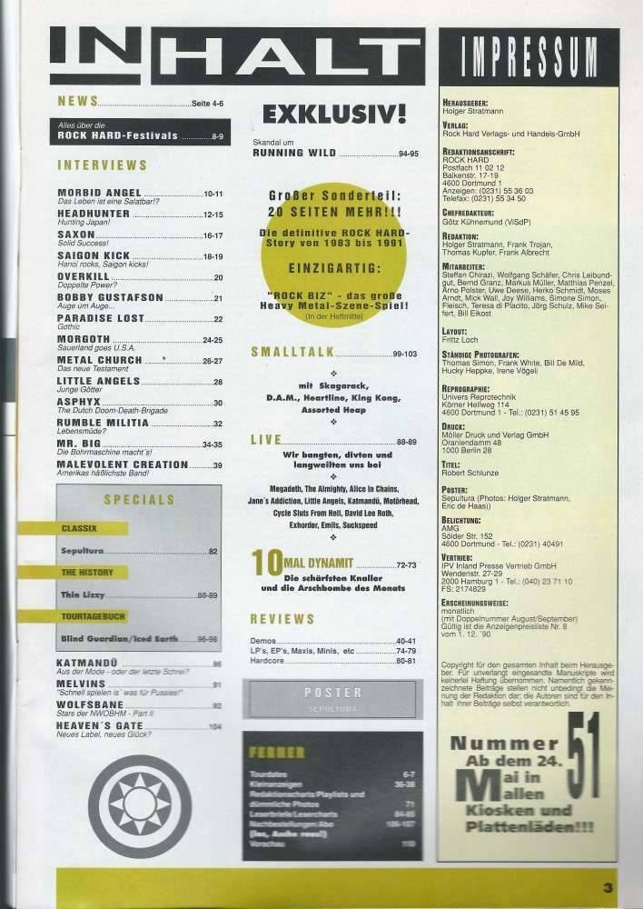 Morbid Angel, Saxon, Headhunter, Morgoth, Mr. Big, Rock-Hard Historie, Thin Lizzy, Running Wild, 13 Seiten Plattenkritiken und vieles andere mehr