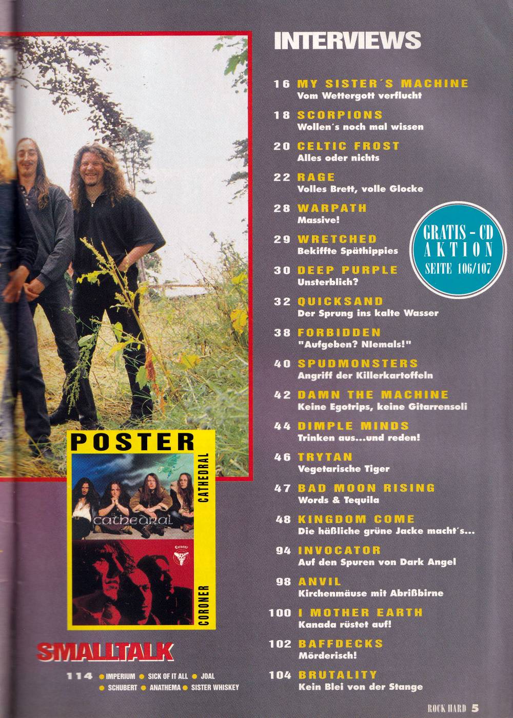 Paradise Lost, Scorpions, Deep Purple, Forbidden, Rage, Kingdom Come, Celtic Frost, Dimple Minds, Warpath, Anvil, Plattentipps auf 12 Seiten, Charts, Live Reviews und noch vieles andere mehr