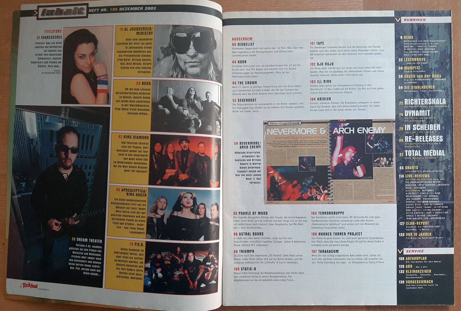 Ministry, Rush, King Diaomd, Triumph, Korn, The Crown, Puddle Of Mudd, Nina Hagen, Evanescence, 19 Seiten Plattenkritiken, DVD-Tipps, Live Reviews und vieles andere mehr