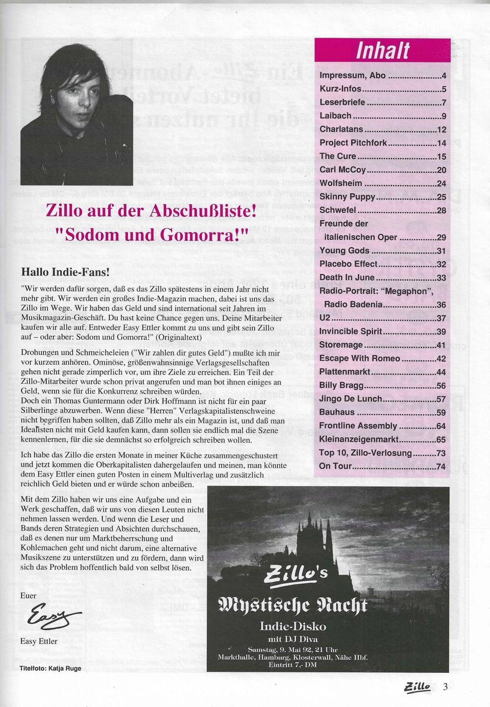 Laibach, The Charlatans, The Cure, Carl McCoy, Skinny Puppy, U2, The Young Gods, Escape With Romeo, Jingo De Lunch, Bauhaus, Plattenkritiken auf 12 Seiten und vieles mehr
