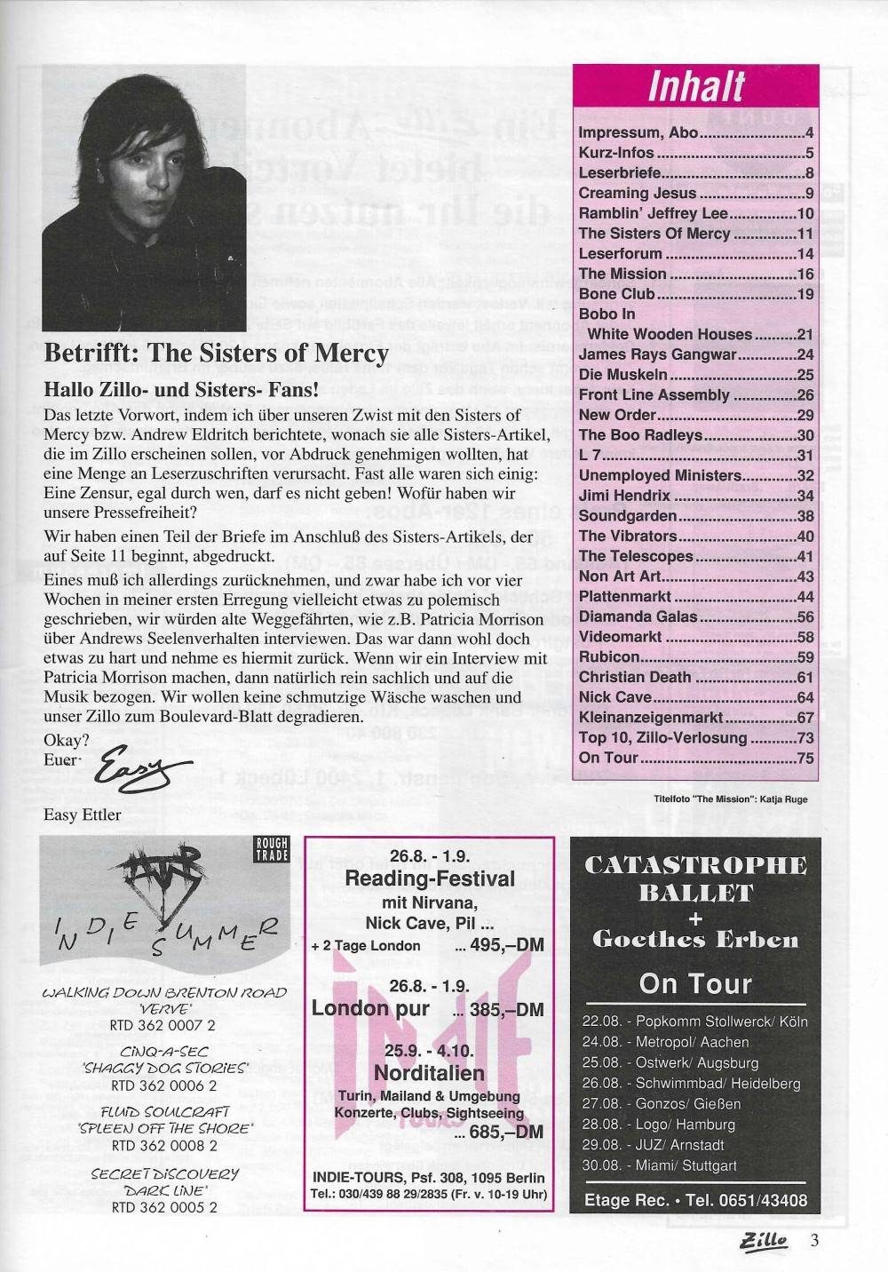 The Sisters Of Mercy, The Mission, Bobo In White Wooden House, Schliessmusikel, Front Line Assembly, New Order, L7, Jimi Hendrix, Soundgarden, The Vibrators, Christian Death, Nick Cave, Plattenkritiken auf 11 Seiten und vieles mehr