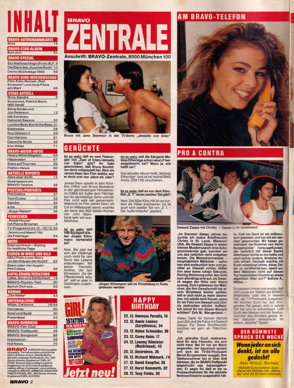 Pierre Brosnan, Alf, Anna, Bravo Talkshow: Phil Collins, Bon Jovi Star-Album, Heavy Metal News, Edelweiss, Depeche Mode, Kim Wilde, Roman, Aufklärung, Foto-Love-Story, Die Hitparaden der Woche, Plattentipps und vieles andere mehr