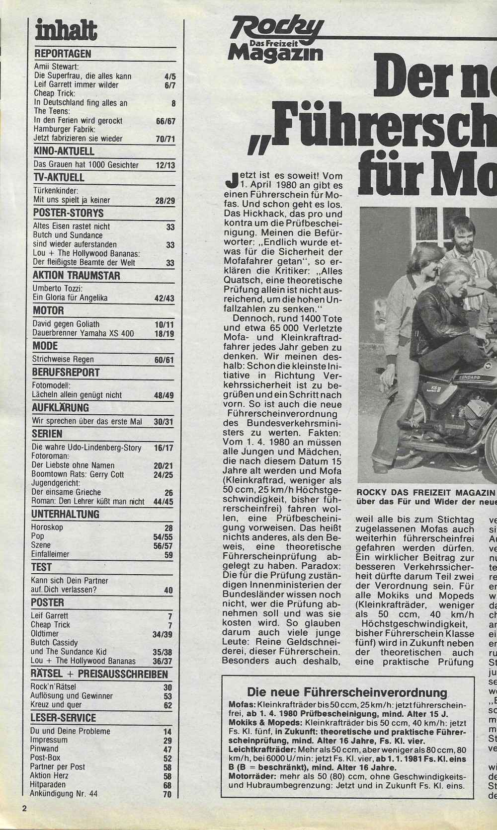 Amii Stewart, Leif Garrett, Cheap Trick, The Teens, Udo Lindenberg Story (Folge 4), Boomtown Rats, Umberto Tozzi, Abba, Hitparaden, Fotoroman, Aufkärung, Rätsel, Roman, Platten- und Szene Tipps und vieles andere mehr