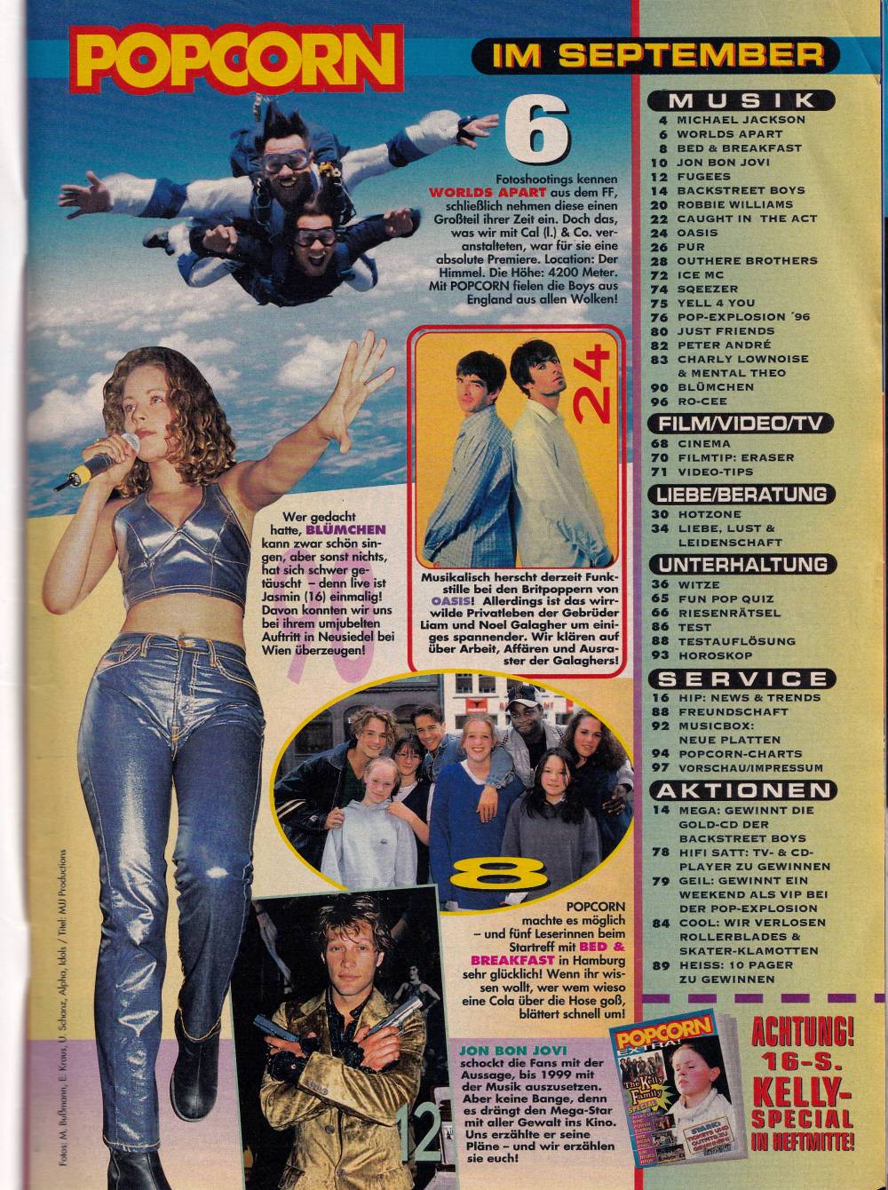 Worlds Apart, Michael Jackson, Bed & Breakfast, Backstreet Boys, Bon Jovi, Robbie Williams, CITA, Oasis, Pur, Blümchen, Hitparaden, Rätsel, Film- und Plattentipps und vieles andere mehr