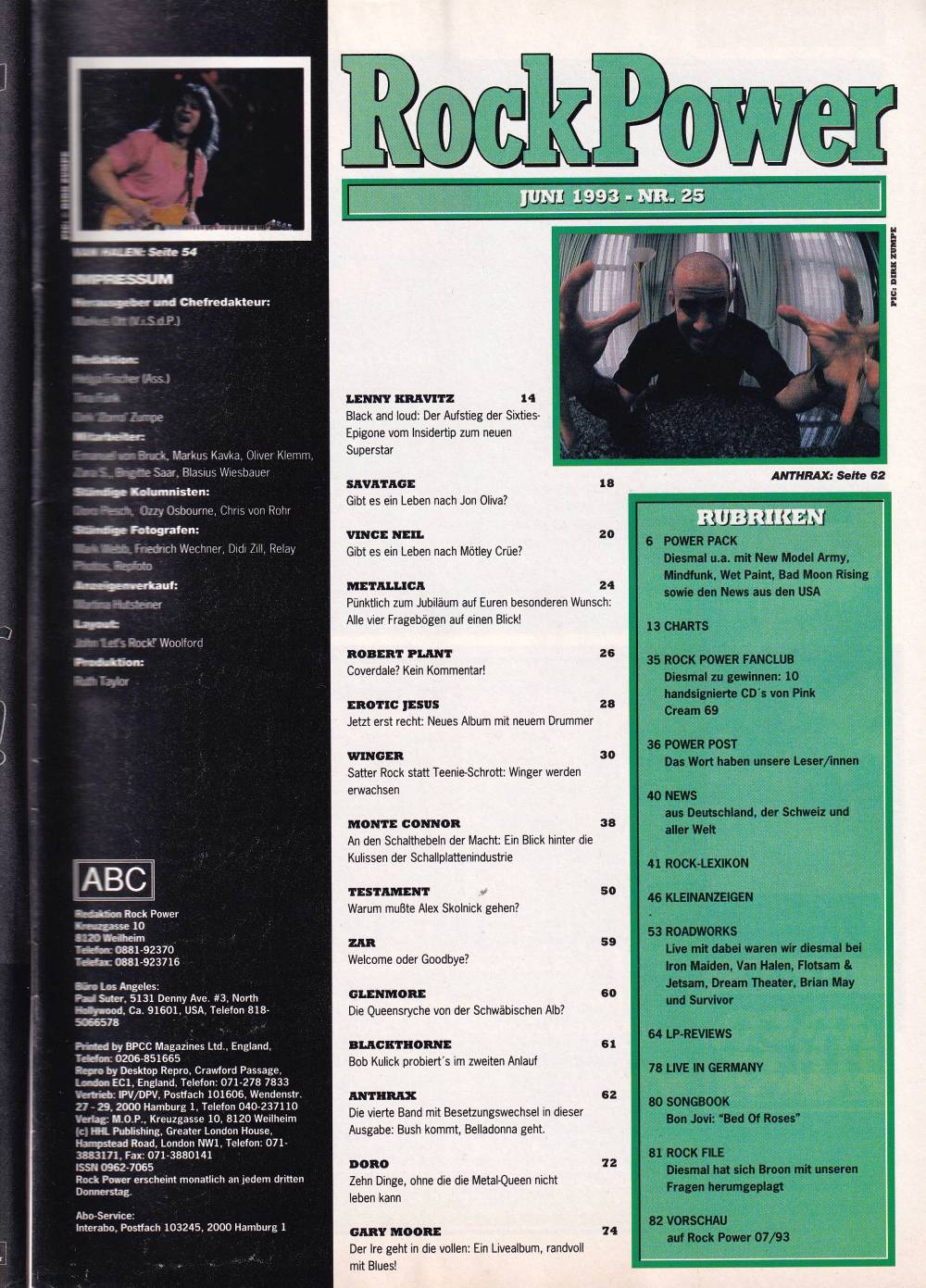 Lenny Kravitz, Savatage, Vince Neil, Metallica, Robert Plant, Winger, Anthrax, Gary Moore, LP-Reviews and much more