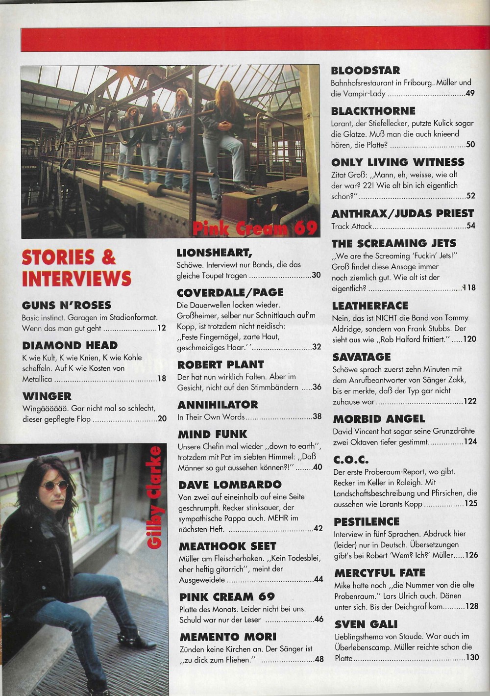 Guns N Roses, Diamond Head, David Coverdale, Robert Plant, Mind Funk, Pink Cream 69, Savatage, The Almighty, Helloween, Ozzy Osbourne, 15 pages of record reviews, video tips, technical information and much more
