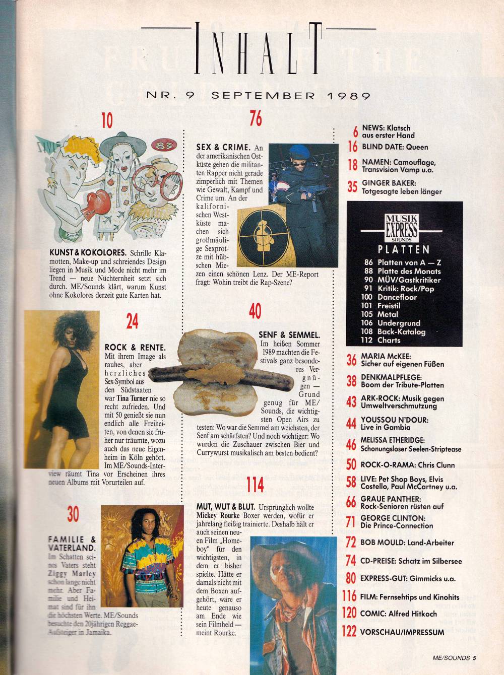 Schrille Outfits, Ziggy Marley, Ginger Baker, Maria McKee, Festivals, Melissa Etheridge, Chris Clunn (Rock-O-Rama), Altherren Sommer, George Clinton, Neil Young, record recommendations on 23 pages, charts, live reviews, film and video recommendations and much more